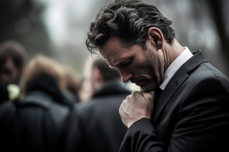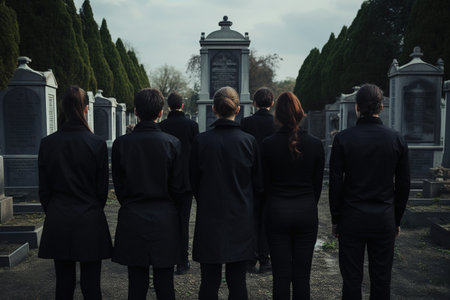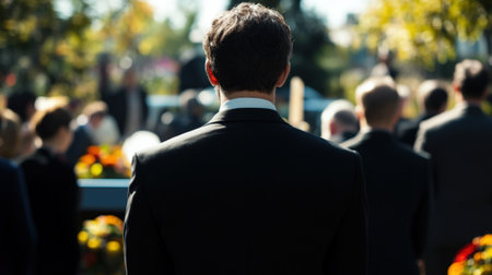 Person in a Black Suit with Funeral Background in a Group. High quality photo