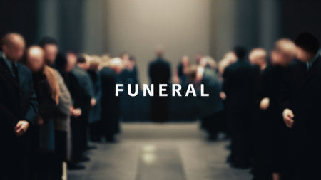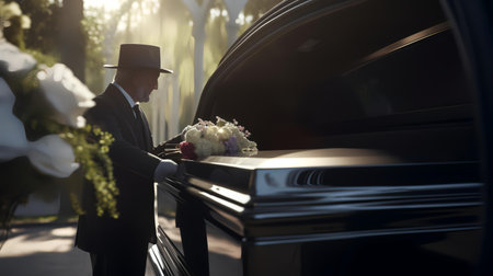 A wooden casket adorned with white lilies is prepared for a funeral service, with mourners gathered in the background. The scene evokes solemnity, respect, and remembrance.