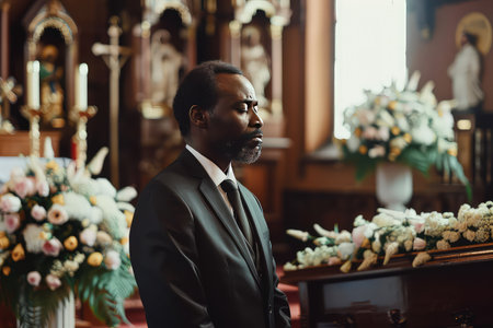 Elegant man in a suit praying in a church during a funeral