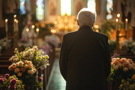An elderly man mourns during a funeral ceremony in a church. View from the back in sunlight