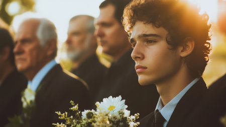 A young man stands thoughtfully at an outdoor funeral, holding a floral arrangement. The warm sunlight casts a serene glow, highlighting emotions of loss and reflection.