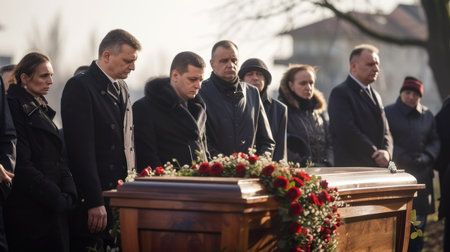 A quiet farewell, a tender moment of the last meeting at the funeral, enveloped in silence and deep emotions of the departed