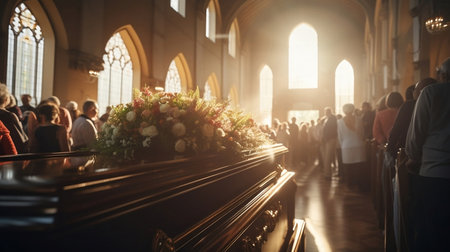 Funeral ceremony. Scene with a coffin in a church. Generative AI