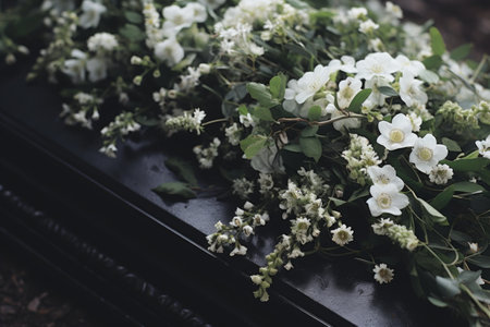 Funeral Scene: Black Casket Covered in White Blooms, Mourning