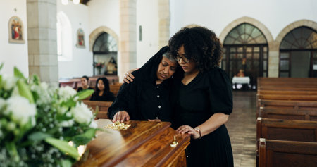 Funeral, coffin and family or friends at death, mourning and church burial event sad together. Depression, grief and christian religion gathering of people and women with support with flowers