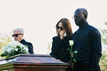 Black young adult woman standing beside coffin with hand resting on casket, appearing emotional, accompanied by Caucasian young adult man and Caucasian young adult woman in mourning attire
