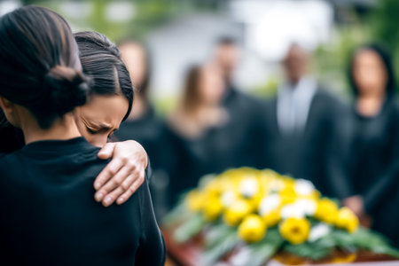 Woman in black attire embraces friend during emotional farewell. Yellow flowers adorn casket in peaceful garden. Concept of memorial services, grief support, emotional connections.