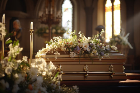 Delicate floral displays adorn a wooden casket, bathed in gentle light within a sacred space, evoking a mood of reverence and quiet mourning.