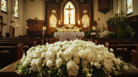 A casket covered in white flowers, placed in the center of a quiet church, creating a scene of solemn beauty and respect for a farewell ceremony