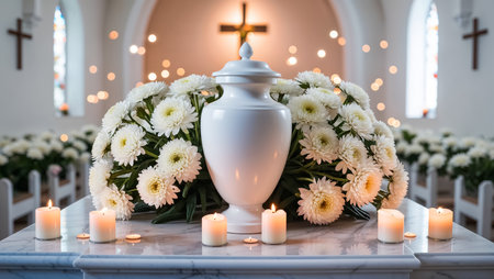 White urn for ashes, flowers, candles