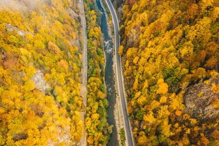 Carpathian river Bila Tisa, the largest tributary of the Danube, Ukrainian mountain river, top view of the river and the road In the village of Luhy. 2020