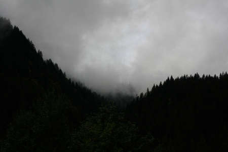 Forested mountain slope in low lying cloud with the evergreen conifers shrouded in mist in a scenic landscape view