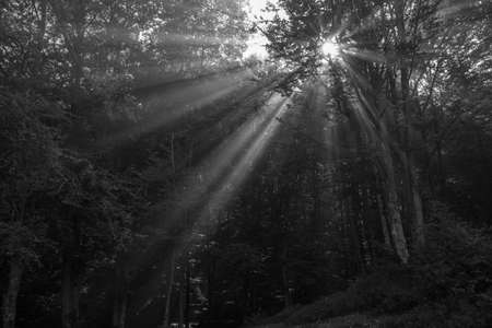 Beautiful scenery with light rays shining through foggy dark woods with evergreen trees in autumn morning. Beautiful wild forest at dawn