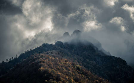 Ghostly alpine view through branches and low clouds to beautiful rockies. Dense fog among giant rocky mountains with trees. Atmospheric highland landscape. Big cliff in cloudy sky. Minimalist scenery.