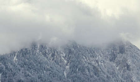 Winter landscape with high mountain hills covered with evergreen pine forest after heavy snowfall on cold wintry day.