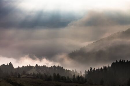 View of majestic mountain forest. Gorgeous foggy hill with colorful coniferous trees. Concept of nature.