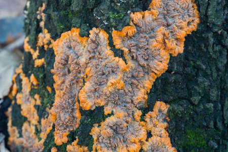 phlebia radiata, wrinkled crust orange fungus on birch tree trunk