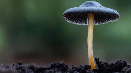 A solitary mushroom with a dark cap and slender stem stands tall in rich, dark soil. The background is softly blurred, highlighting the fungi.
