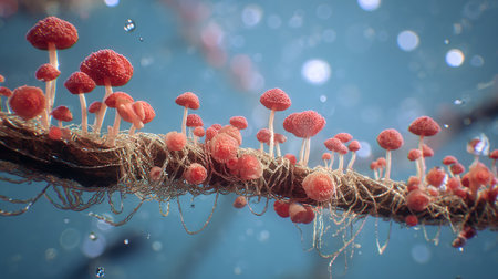 Fungi Trichophyton mentagrophytes, 3D illustration showing macroconidia, branched conidiophores bearing spherical conidia, septate and spiral hyphae. Causes ringworm, hair and nail infections
