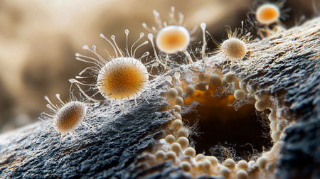 Detailed macro shot of fungal spores with radiating hyphae on a textured surface. The image captures the intricate structures and textures of the microscopic world.