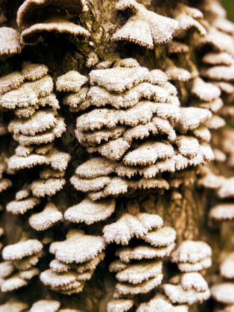 Multi-colored tree mushrooms on an old tree trunk close-up.