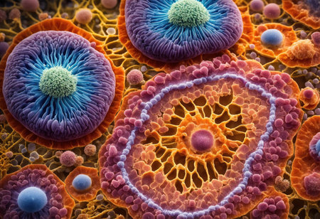 Close examination shows various cell types with striking color contrasts, highlighting their unique structures and textures in a biological context.