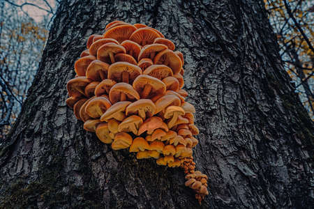 Orange edible mushrooms flammulina velutipes on dark wood. Nature mushrooms texture. Wood mushrooms background.