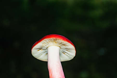 Close up vertical shot of a single wild mushroom growing through different vegetation. Moody autumnal background, nature freshness with white fungal species on the meadow. Fall season atmosphere.