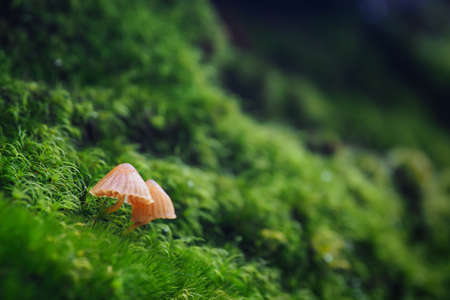Brown wood mushrooms on thin legs grow on mossy stump on green forest bokeh background. Mushroom macro photography. Warm and lovely sunlight.