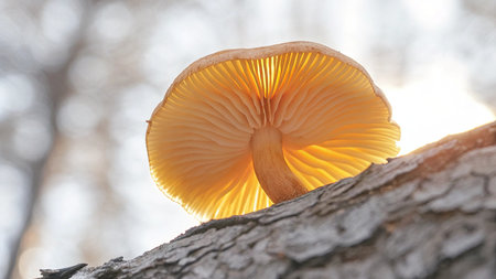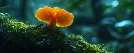 AI Generated. Vibrant Golden Mushroom on Mossy Log Closeup