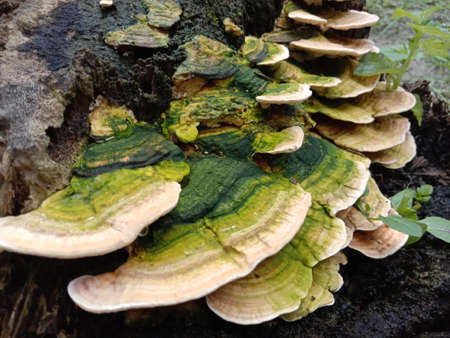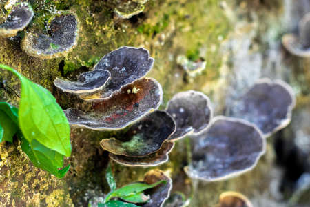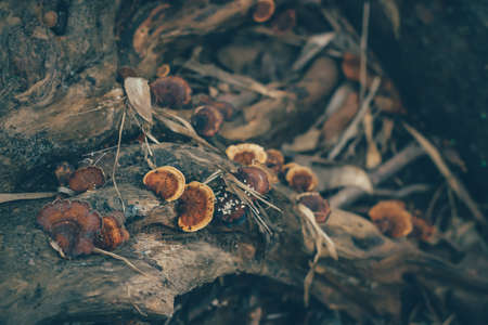 Mushrooms growing on an old tree in the forest. Selective focus.