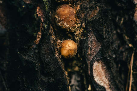 Texture of old pine close-up. Incredibly beautiful pattern. Mushroom grew on tree. Macro photography.