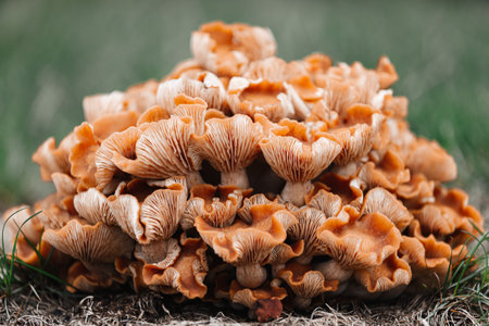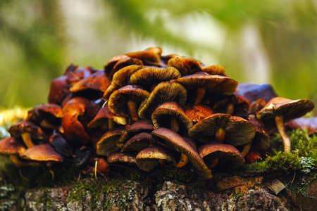 Close-up Edible mushrooms of honey agarics in a coniferous forest. Group of mushrooms in the natural environment