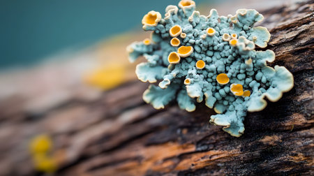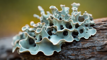 A detailed macro shot showcases a delicate bluegreen lichen with intricate, corallike structures growing on weathered wood.