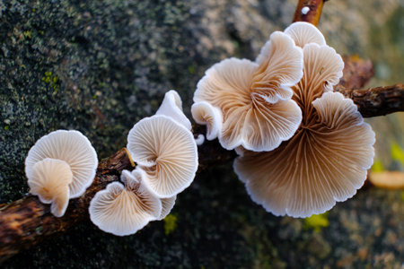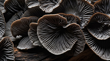 Macro shot of a dense cluster of oyster mushrooms, highlighting their delicate gill patterns and organic growth.