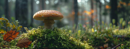 This captivating image features mushrooms in a serene forest setting. Surrounded by fallen leaves and pine needles, the scene invokes tranquility and the beauty of nature.