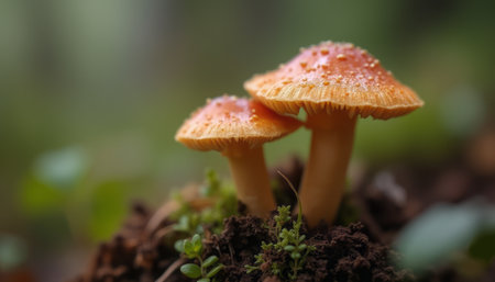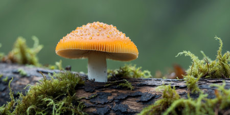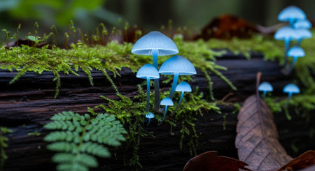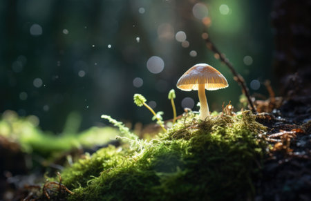 A stunning close-up of a glowing mushroom adorned with dew drops. This enchanting forest scene captures the beauty of nature and tranquility.