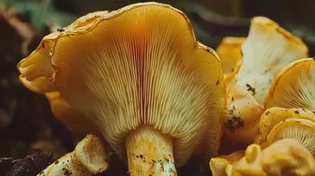 A stunning close-up view of chanterelle mushrooms showcasing intricate gills and vibrant colors in a rich natural forest environment.