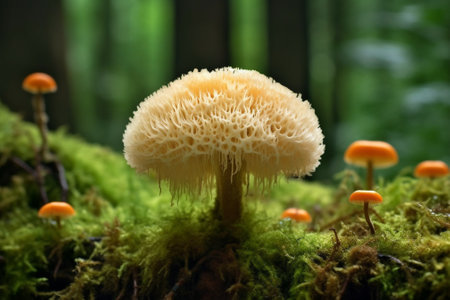 An AI generated illustration of a close-up of a mushroom growing on a lush green moss-covered ground