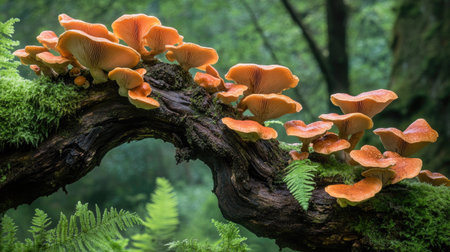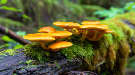 Discover a striking image of vibrant orange mushrooms thriving on a moss-covered log, set in a tranquil forest environment. This close-up captures the beauty of nature and showcases the intricate details of fungi in their natural habitat.