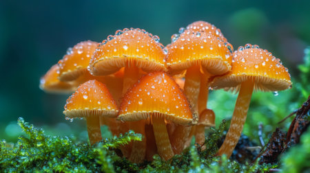 A macro shot of a cluster of mushrooms on a damp forest floor, with clear water droplets enhancing their texture and vibrant colors