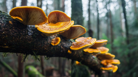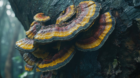 Close-up of vibrant Reishi mushrooms growing on the bark of an old tree in a shaded forest