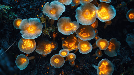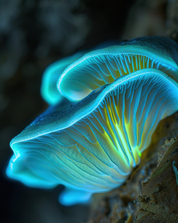 Discover a stunning close-up of bioluminescent mushrooms glowing in a dark forest, showcasing nature's magical beauty and vibrant colors.