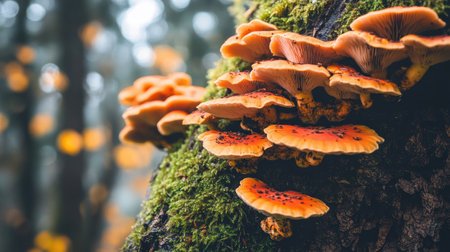 A cluster of vibrant orange mushrooms grows on a moss-covered tree trunk, showcasing nature's beauty in a serene forest setting. Ideal for eco-themed imagery.