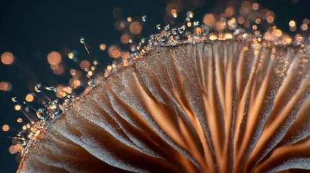 This stunning macro photograph captures a mushroom cap adorned with glistening water droplets, highlighting its intricate texture and natural beauty.