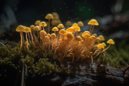 An AI generated illustration of bright yellow mushrooms nestled in a lush, moss-covered forest