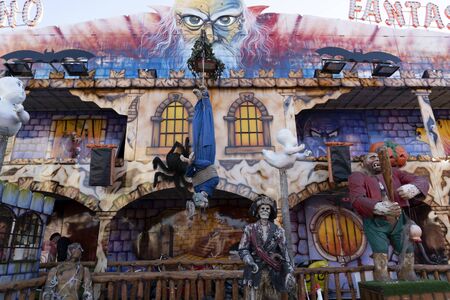 Paris, France - August, 8th, 2017. Psychos attraction of horror in Paris amusement park, located on place de la concorde. Evil ghost house and gigantic haunted tree in french theme park.