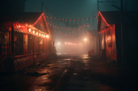 Abandoned amusement park at night with a lot of lights and fog