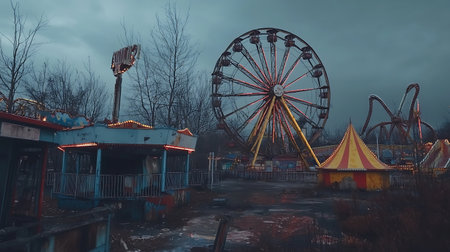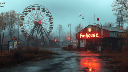 The image depicts a desolate and abandoned summer carnival with empty and silent rides and attractions illuminated by the soft fading light of dusk The atmosphere is one of melancholy and longing as