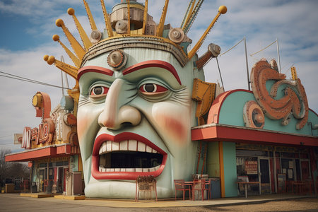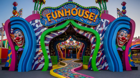 A vibrant and colorful funhouse entrance features large, sculpted clown faces and psychedelic patterns. A winding path leads into the attraction, inviting visitors to explore the whimsical and slightly eerie carnival architecture.